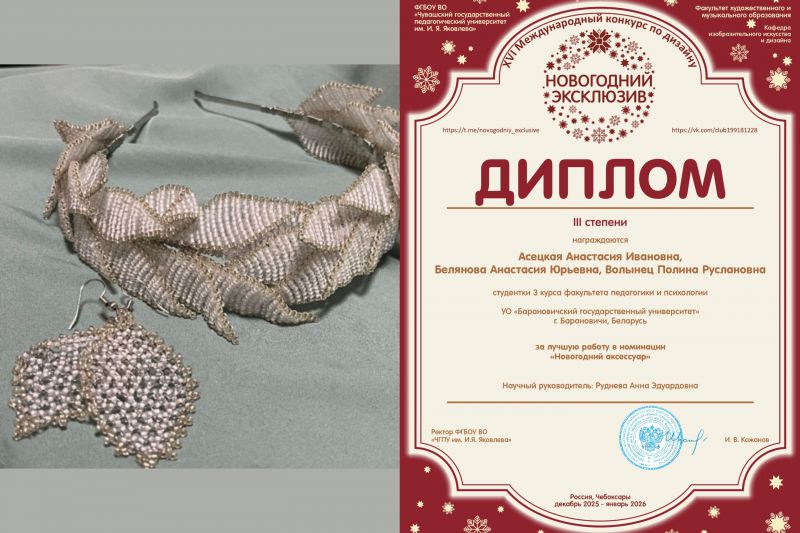 - Блакицкая Марина Валерьевна, Белявская Алина Дмитриевна, студентки специальности ОТИ, в номинации «Новогодний аксессуар» (научный руководитель: Руднева А.Э.);