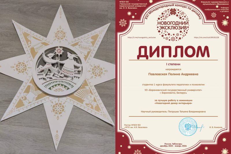 - Павловская Полина Андреевна, студентка специальности ОТИ, в номинации «Новогодний декор интерьера» (научный руководитель: Петрушко Т.В.);
