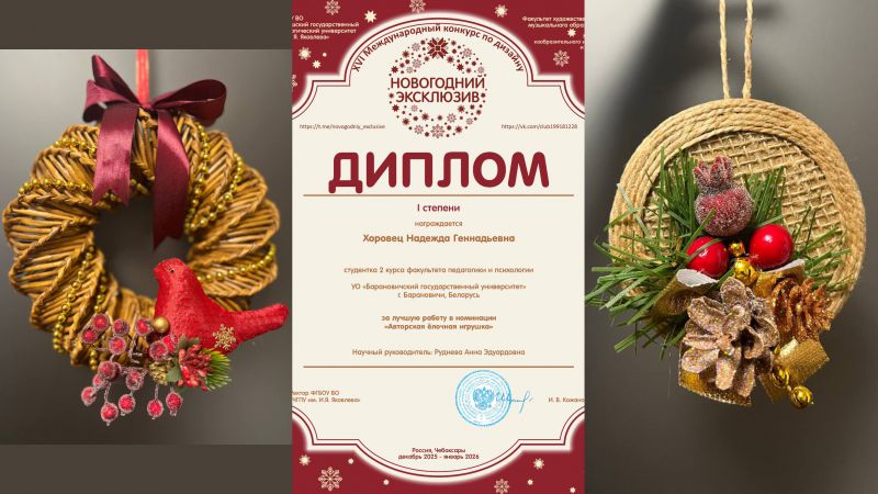 - Хоровец Надежда Геннадьевна, студентка специальности ОТИ, в номинации «Авторская ёлочная игрушка» (научный руководитель: Руднева А.Э.).